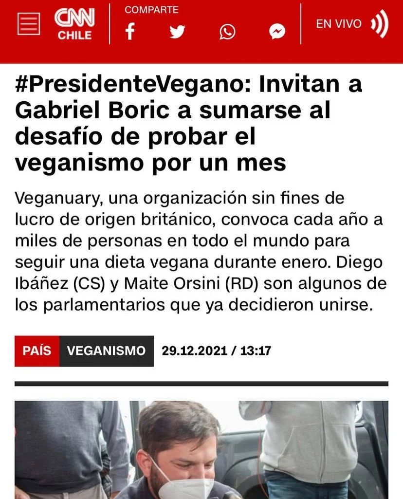 📢❗️Nuestra invitación al presidente electo de Chile @gabrielboric, para probar el veganismo en enero con Veganuary, apareció hoy en CNN Chile, destacando además la participación de otr@s congresista del país que aceptaron ser parte de la iniciativa mundial.