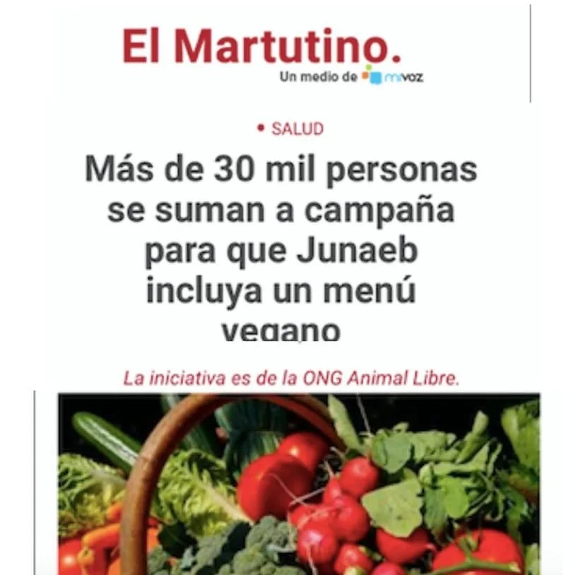 📣Los medios hacen eco de nuestro alcance de 30 mil personas que han firmado para que @gobiernojunaeb incorpore una opción de menú vegano en el Programa de Alimentación Escolar.