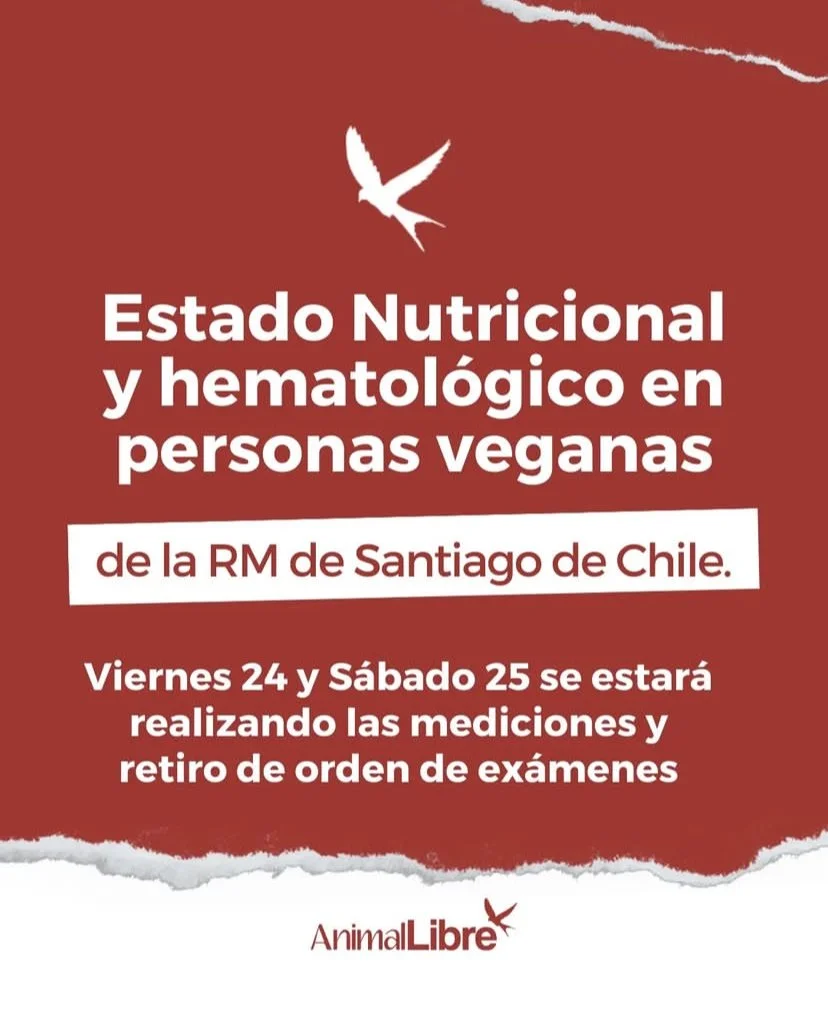 👉 Le invitamos a participar del estudio a cargo de la Dirección de Estudios de Animal Libre: “Estado nutricional y hematológico en personas veganas de la RM de Santiago de Chile". Es importante derribar mitos en base a la evidencia científica, por lo que contamos con el apoyo de cada uno/una de ustedes para aumentar conocimiento e investigación.