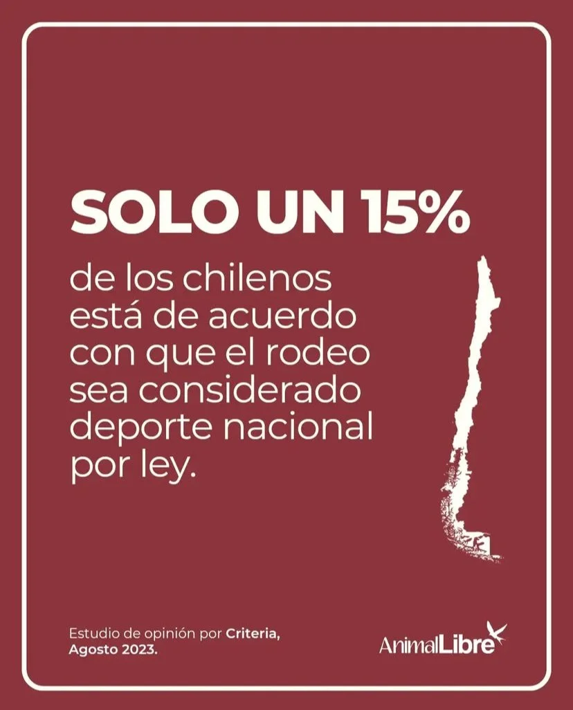 👉 A new study conducted by Criteria at the request of Animal Libre revealed, for the second time, that the majority of Chileans (75%) don’t identify with rodeo, while 64% expressed being against it being considered the national sport.